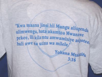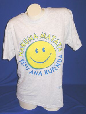 We offer a wonderful outreach t-shirt, designed by Terry Veazey, that says "Hakuna Matata, Yesu Ana Kupenda" ("Don't Worry, Jesus Loves You") in the Swahili language with a bright yellow smiley face in the center.  On the back is the entire John 3:16 scripture verse, also in Swahili.  The shirt is a light gray color, and is 50% polyester, 50% cotton (should not shrink).  The art design is in two colors.  Makes a great conversation opener.