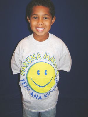 We offer a wonderful outreach t-shirt, designed by Terry Veazey, that says "Hakuna Matata, Yesu Ana Kupenda" ("Don't Worry, Jesus Loves You") in the Swahili language with a bright yellow smiley face in the center. On the back is the entire John 3:16 scripture verse, also in Swahili. The shirt is a light gray color, and is 50% polyester, 50% cotton (should not shrink). The art design is in two colors. Makes a great conversation opener. Child's medium (10 - 12) available.
